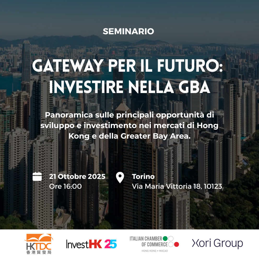 Promuovere nuove opportunità di sviluppo tra Italia e Asia è l’obiettivo del seminario Gateway per il Futuro: Investire nella GBA (Greater Bay Area), organizzato dalla Italian Chamber of Comemrce in Hong Kong and Macao in collaborazione con Hong Kong Trade Development Council, Invest Hong Kong e Xori Group. L’iniziativa si terrà a Torino e offrirà un’occasione concreta di approfondimento e networking per le imprese italiane interessate a esplorare le prospettive di crescita in una delle aree economiche più dinamiche al mondo.
