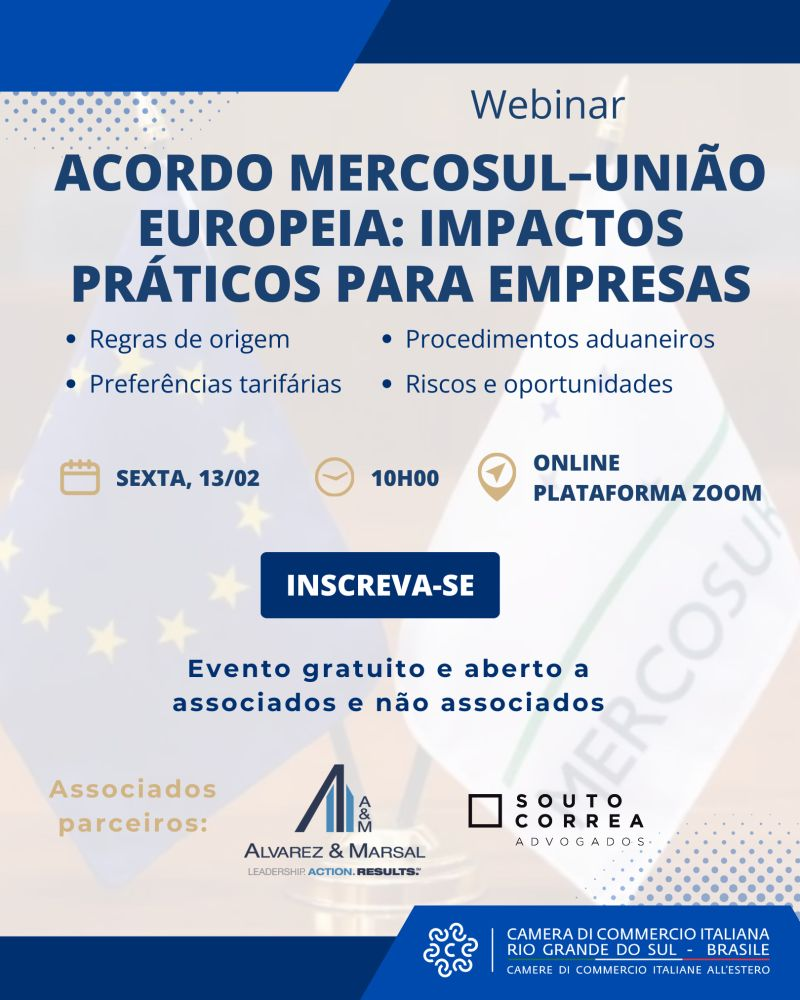 La Camera di Commercio Italiana nel Rio Grande do Sul promuove il webinar “Accordo Mercosur–Unione Europea: impatti pratici per le imprese”, un appuntamento di approfondimento dedicato alle aziende interessate a comprendere le reali implicazioni operative di uno dei più rilevanti accordi commerciali negoziati dal Brasile con l’Unione Europea.