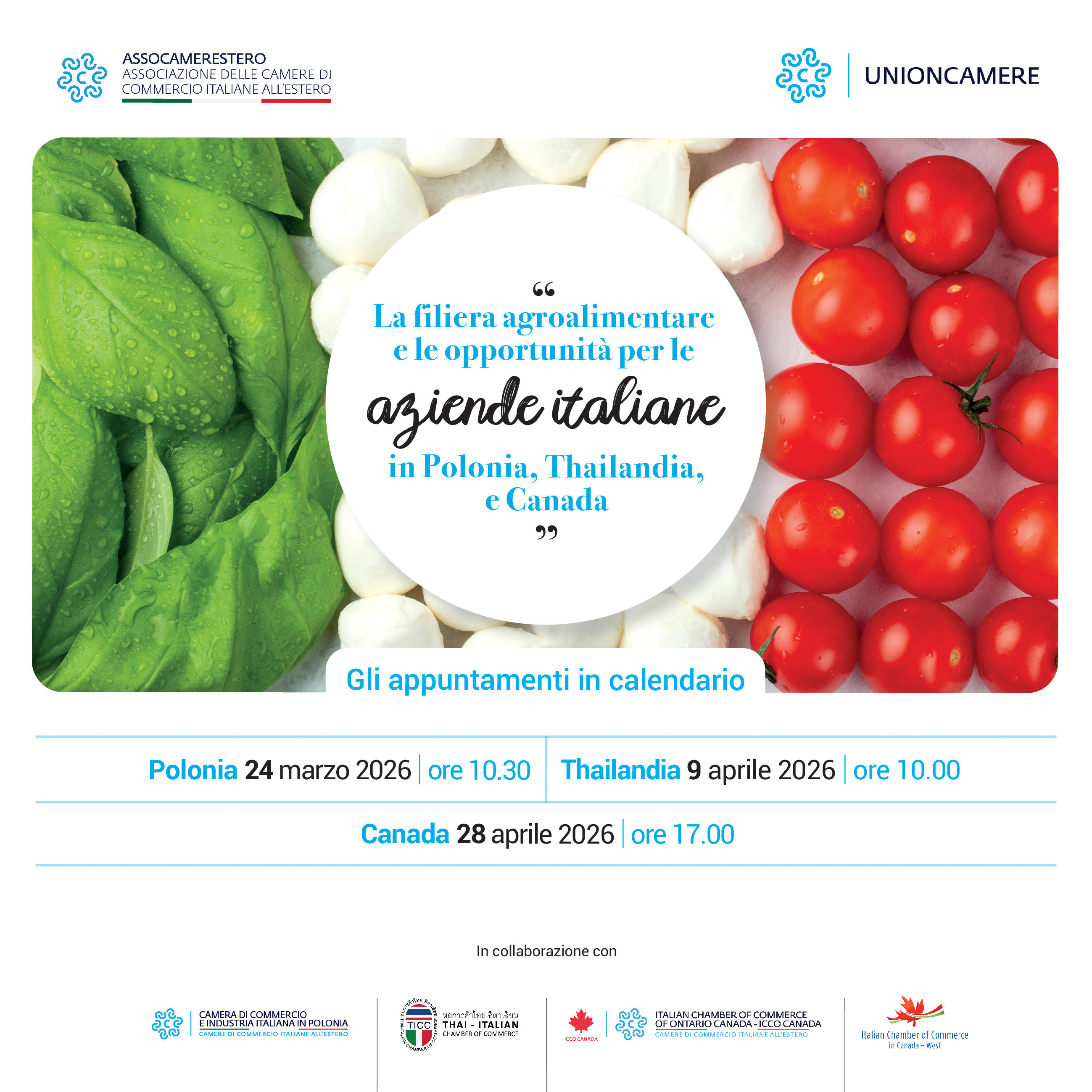 Assocamerestero, con il contributo di Unioncamere, organizza una ciclo di webinar dedicati alle aziende italiane del settore agroalimentare interessate a esplorare 3 mercati ad alto potenziale: Polonia, Thailandia e Canada.