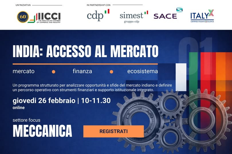 La IICCI - The Indo-Italian Chamber of Commerce and Industry, insieme a SIMEST, SACE e Cassa Depositi e Prestiti, promuove il webinar “Italia & India: Opportunità, Settori e Strumenti Operativi. Meccanica (generica + macchine strumentali)”, in programma il 26 febbraio.
