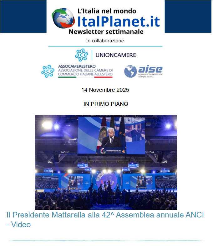 La newsletter di ItalPlanet, pubblicata in collaborazione con Assocamerestero e Aise.it – inviata in Italia e all’estero – è un servizio settimanale che consente di ricevere news e approfondimenti sul Sistema Italia e sulle attività svolte dalle Camere Italiane nel mondo.