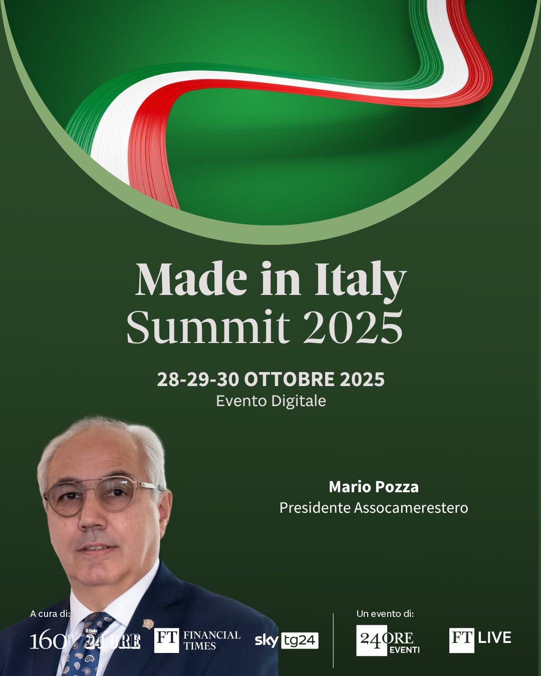 Anche quest'anno Assocamerestero e la rete delle Camere di Commercio Italiane all'Estero, partecipano al Made in Italy Summit, l’evento digitale organizzato da Il Sole 24 Ore, in collaborazione con il Financial Times e Sky TG24, dedicato al futuro del brand Italia nell’attuale scenario economico e geopolitico globale.