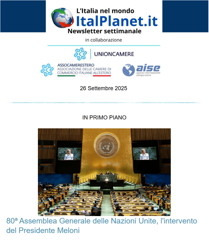 La newsletter di ItalPlanet, pubblicata in collaborazione con Assocamerestero e Aise.it – inviata in Italia e all’estero – è un servizio settimanale che consente di ricevere news e approfondimenti sul Sistema Italia e sulle attività svolte dalle Camere Italiane nel mondo.