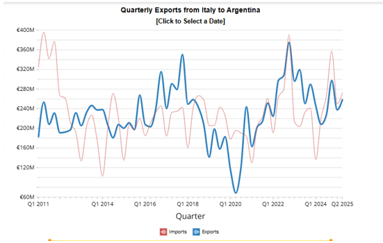 In Agosto 2025, l’Argentina ha esportato 151 milioni di dollari e ha importato 123 milioni di dollari dall’Italia, terminando quindi con un saldo commerciale positivo di 28,2 milioni di dollari. Tra Agosto 2024 e agosto 2025, le esportazioni Argentine sono aumentate del 49,9%, passando da 101 milioni di dollari a 151 milioni di dollari; mentre le importazioni sono aumentate del 29,3%, passando da 95,2 milioni a 123 milioni di dollari.