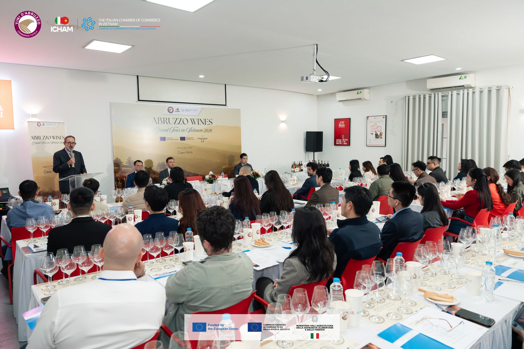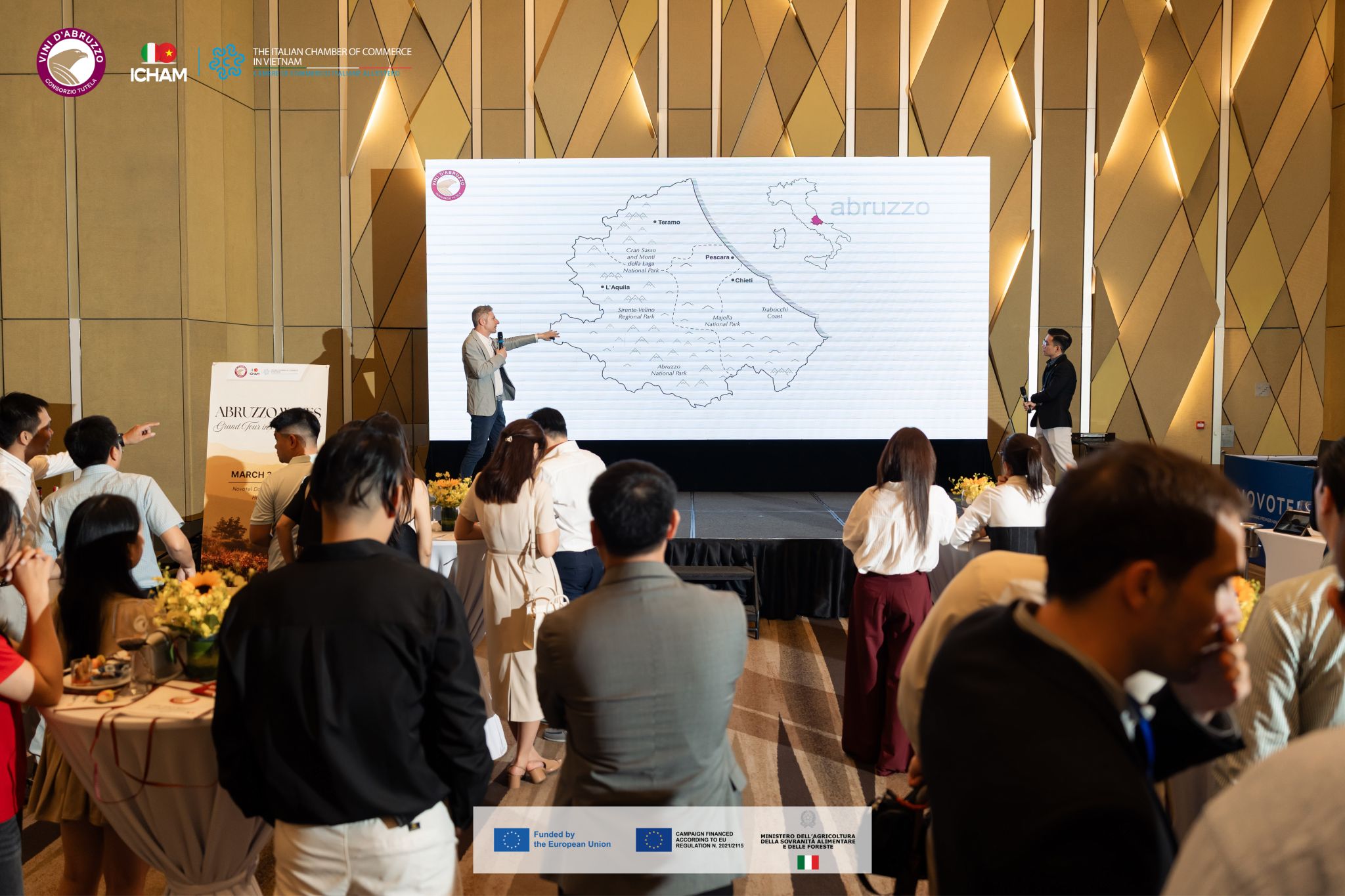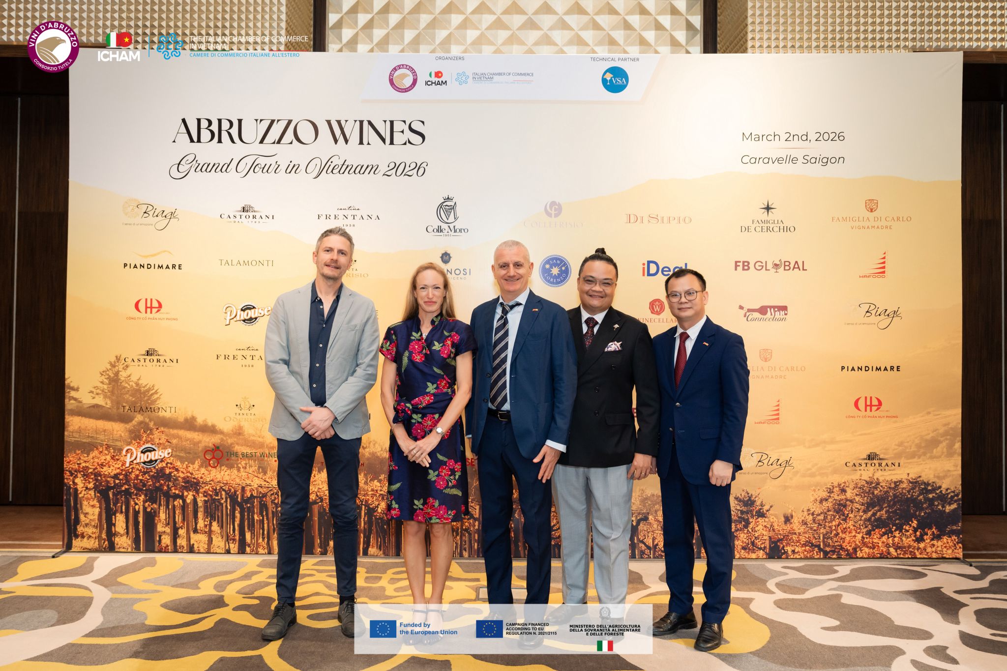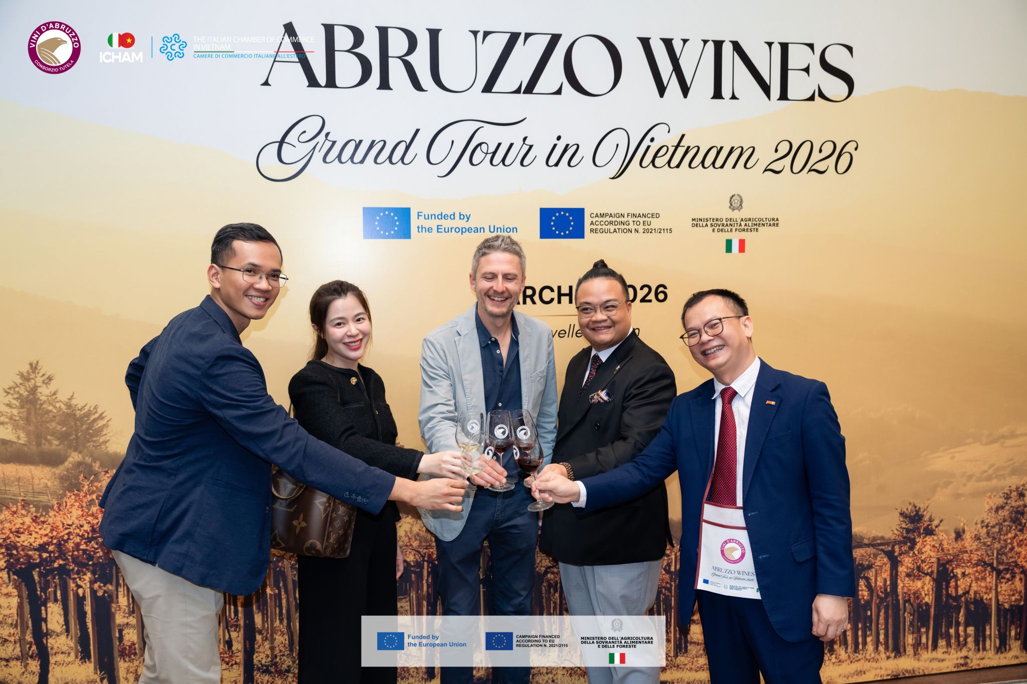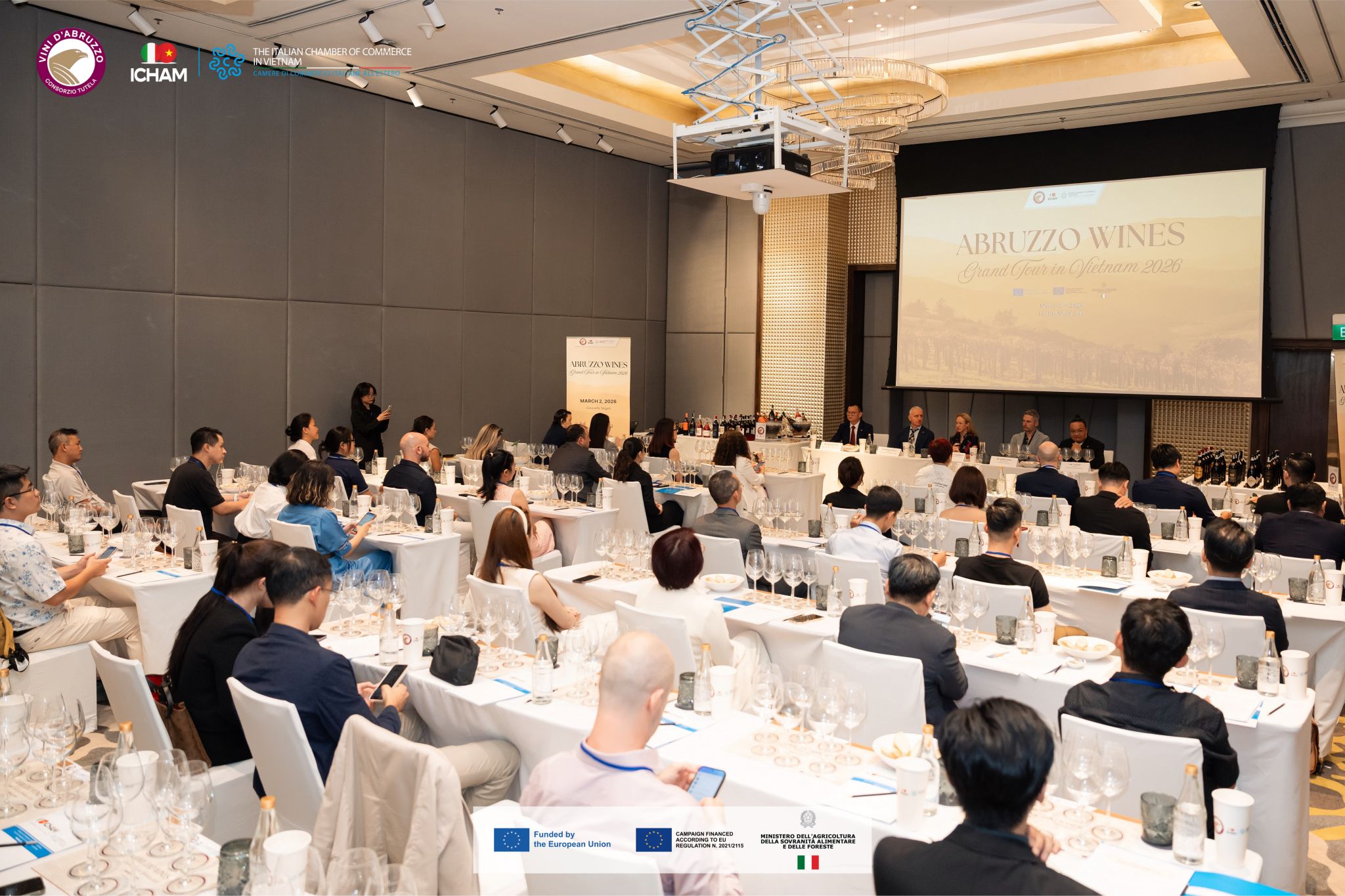 • Ho Chi Minh City (2 marzo): Il debutto presso il Caravelle Saigon ha visto la partecipazione della Console Generale d’Italia, Alessandra Tognonato, del Presidente ICHAM Michele D’Ercole e di Davide Acerra per il Consorzio Tutela Vini d'Abruzzo. Una Masterclass tecnica su 14 etichette ha aperto la giornata, seguita da un evento di networking con 10 tra i principali importatori locali.