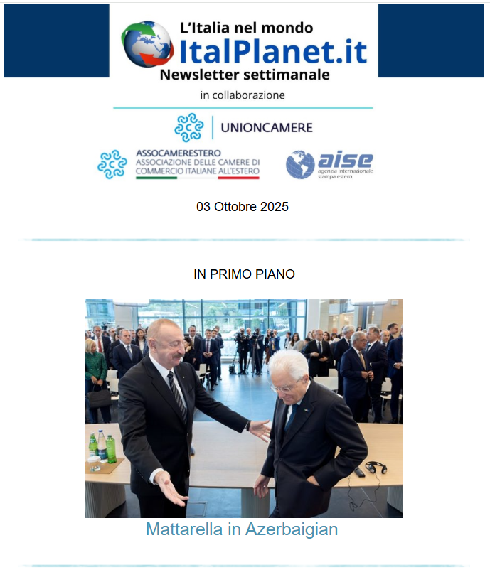 La newsletter di ItalPlanet, pubblicata in collaborazione con Assocamerestero e Aise.it – inviata in Italia e all’estero – è un servizio settimanale che consente di ricevere news e approfondimenti sul Sistema Italia e sulle attività svolte dalle Camere Italiane nel mondo.